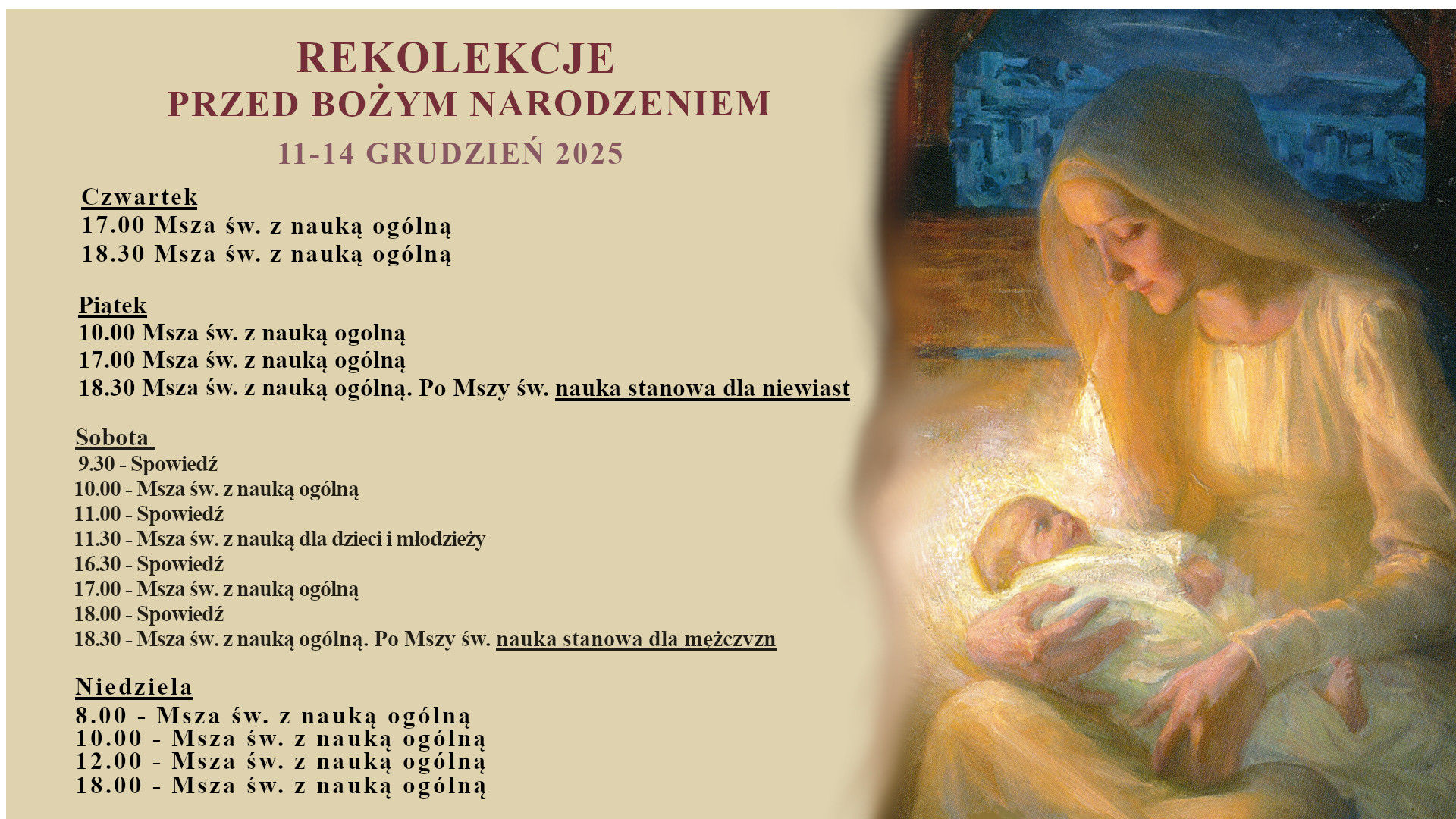 W przygotowaniach do świąt Bożego Narodzenia na pierwszym miejscu stawiamy duchowe przygotowanie. Zapraszamy na rekolekcje do naszego sanktuarium, świeżo poświęconego.