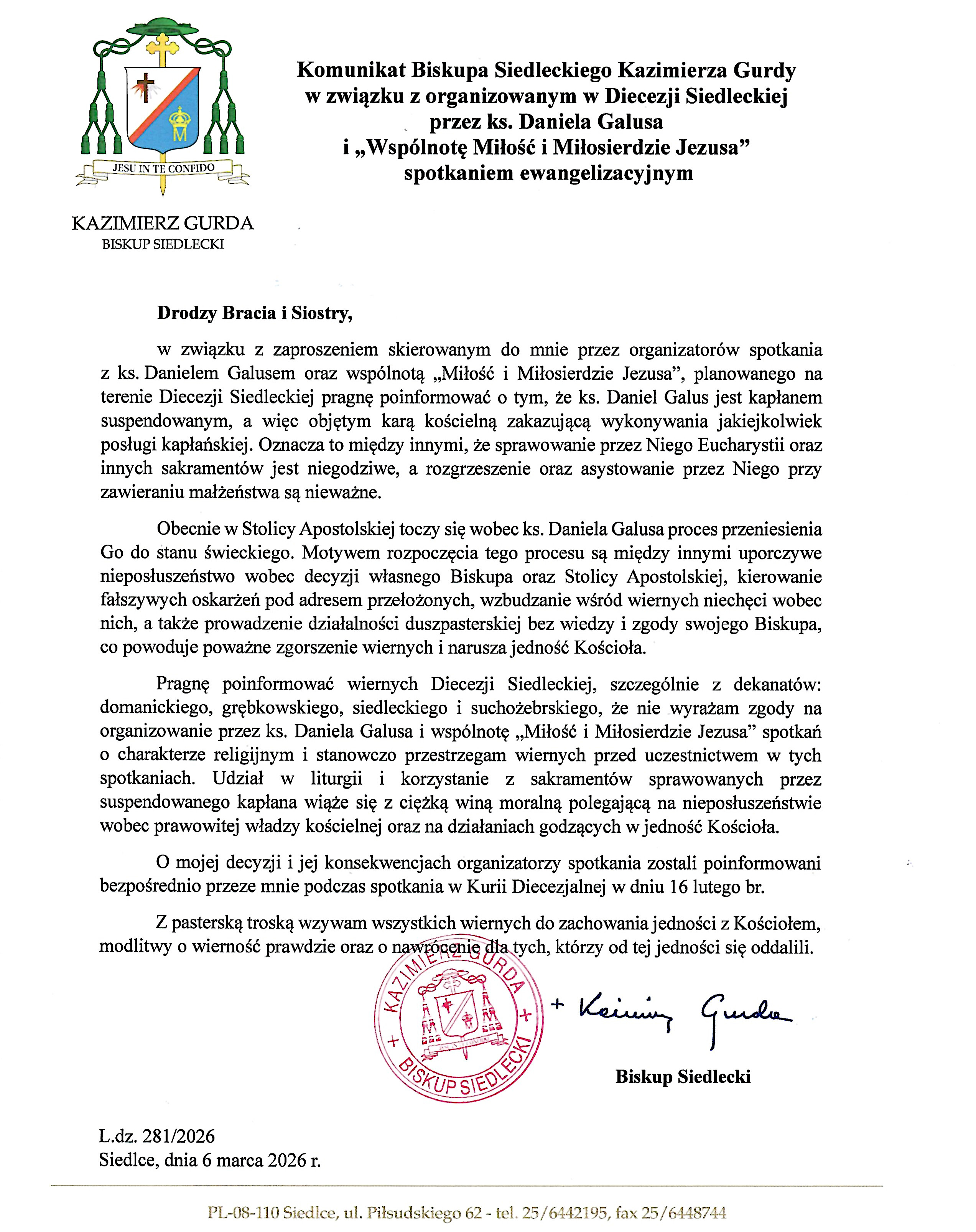 Treść komunikatu dotyczy ks. Daniela Galusa i jego działalności także na terenie diecezji siedleckiej.