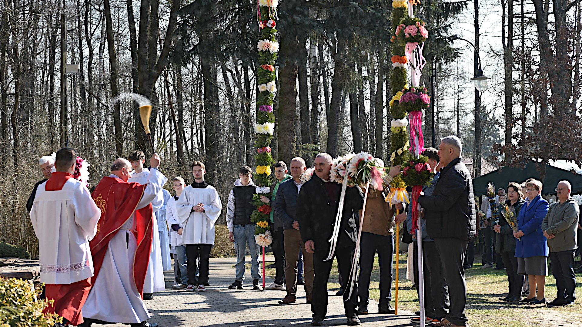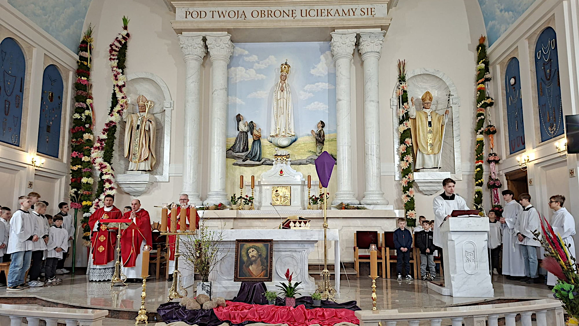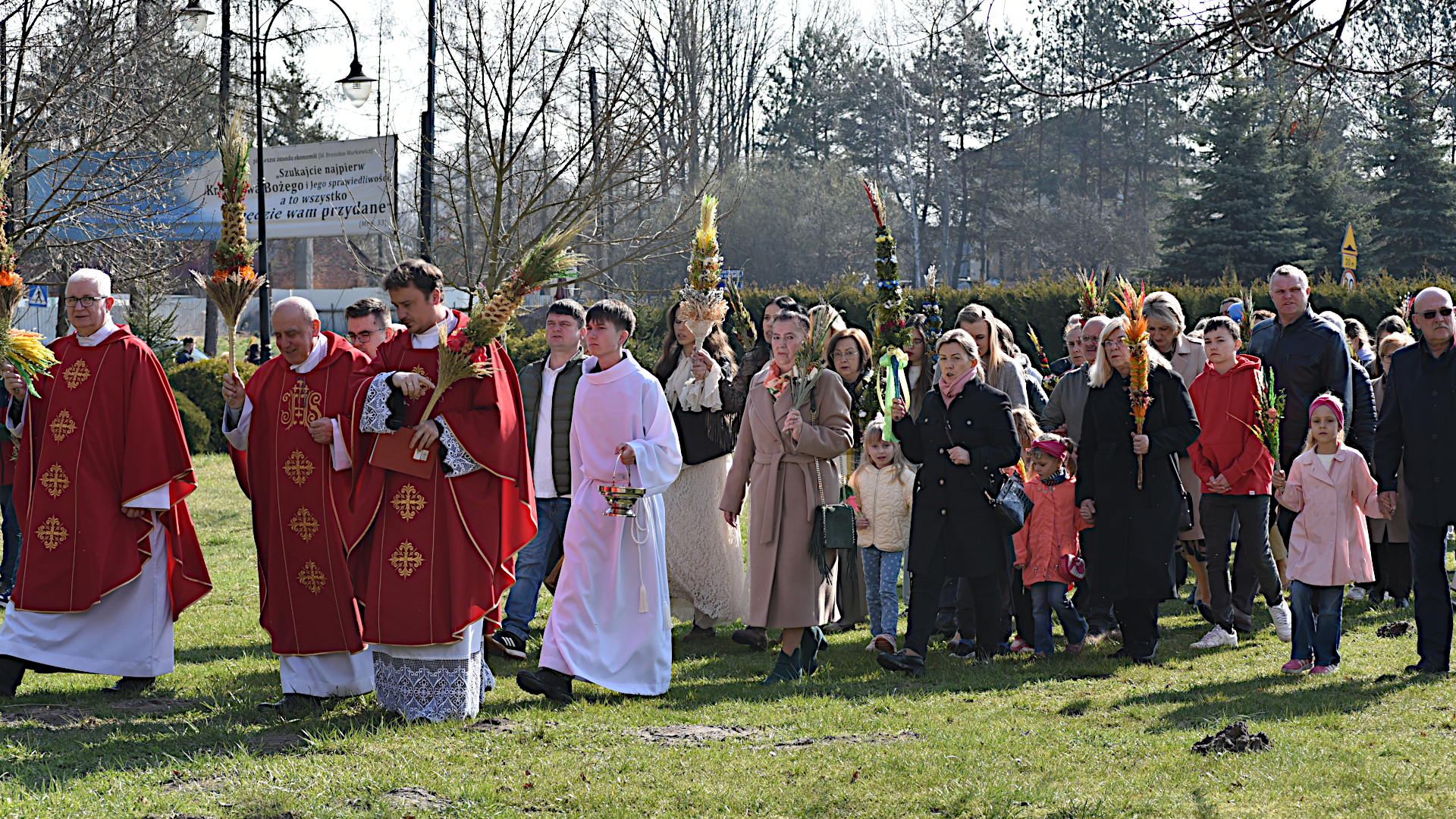W sanktuarium uroczysta procesja upamiętniająca to wydarzenie wyruszyła od ołtarza fatimskiego do kościoła o godz. 10.00. Tradycją już stało się przygotowywanie przez poszczególne sołectwa parafii okazałych kilkumetrowych palm, które po wniesieniu do świątyni zdobią ścianę głównego ołtarza. Oczywiście wszyscy (prawie wszyscy) uczestniczący w procesji nieśli swoje, mniejsze, ale również okazłe palmy. Dla uczczenia Jezusa, Króla wszechświata i naszego Zbawiciela.