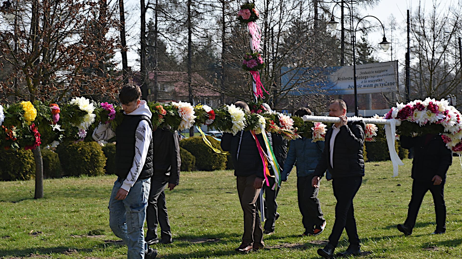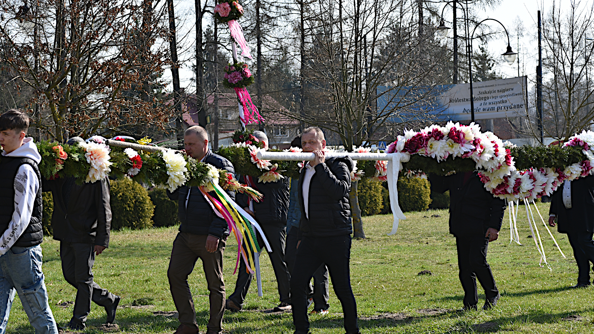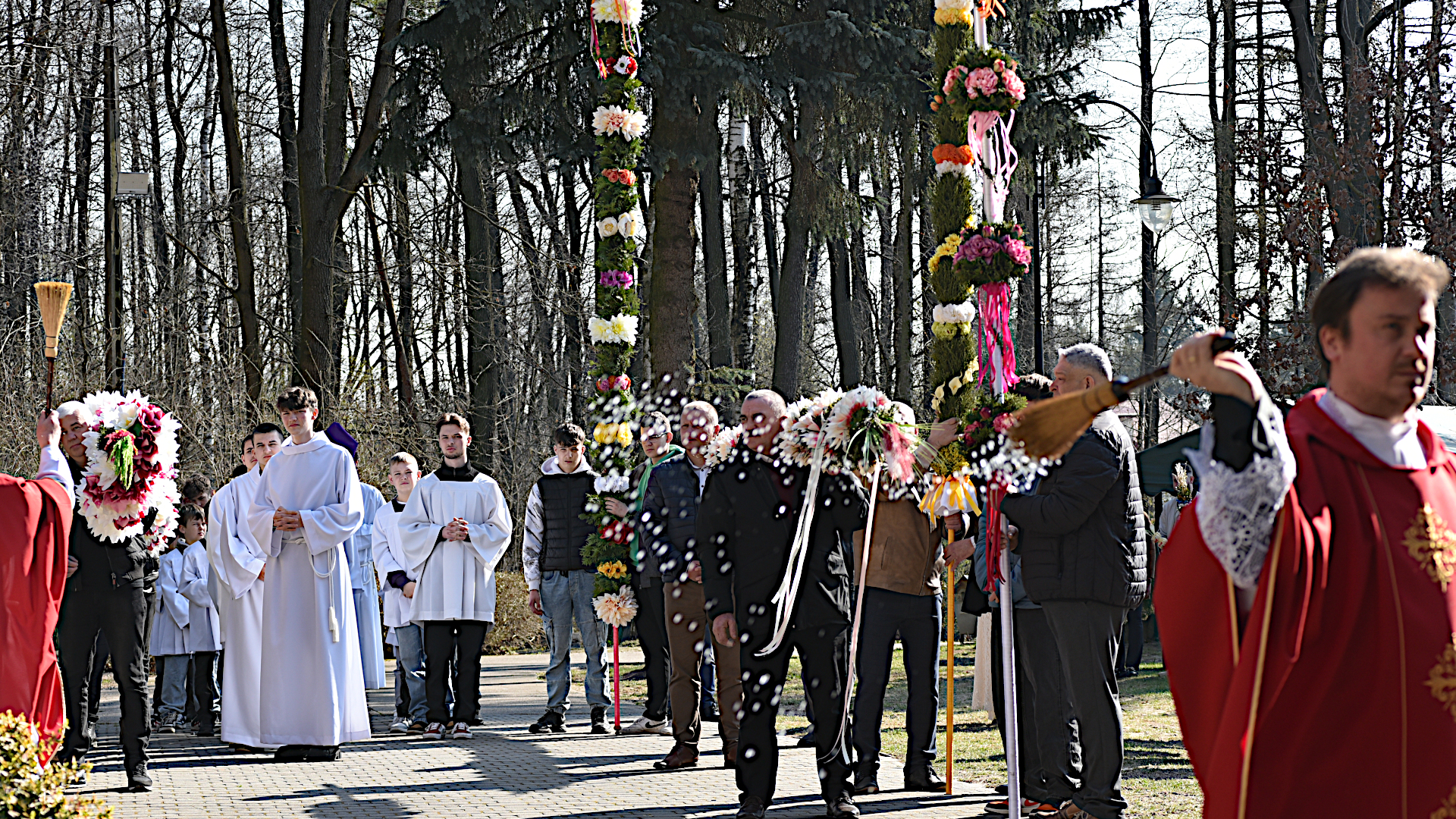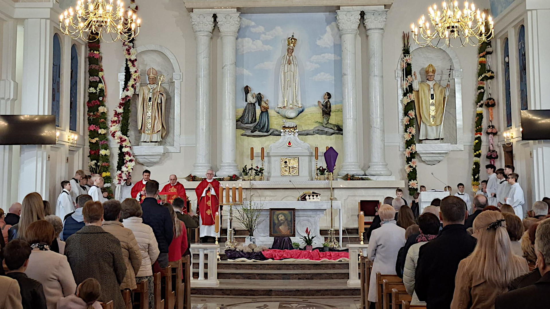 W sanktuarium uroczysta procesja upamiętniająca to wydarzenie wyruszyła od ołtarza fatimskiego do kościoła o godz. 10.00. Tradycją już stało się przygotowywanie przez poszczególne sołectwa parafii okazałych kilkumetrowych palm, które po wniesieniu do świątyni zdobią ścianę głównego ołtarza. Oczywiście wszyscy (prawie wszyscy) uczestniczący w procesji nieśli swoje, mniejsze, ale również okazłe palmy. Dla uczczenia Jezusa, Króla wszechświata i naszego Zbawiciela.