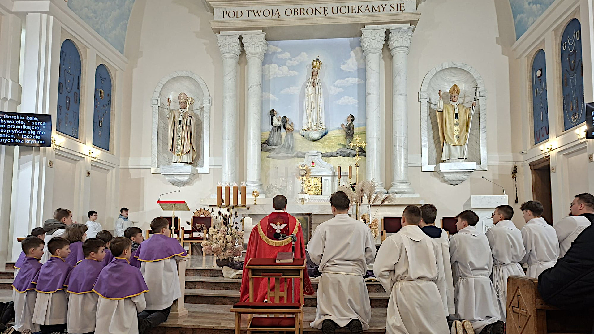 W Adwencie ustawia się wieniec z czterema świecami, na Boże Narodzenie pojawiają się szopki (stałe, ruchome, żywe, z gipsu, drzewa, tworzywa itd.) i oczywiście kolorowe choinki, w Wielkim Poście dekoracje nawiązują do pokuty, przemiany, cierpień. W naszym sanktuarium pojawiały się niekiedy szorstkie kamienie, uschłe ciernie, zasmucony Pan Jezus (tym razem obraz w cierniowej koronie) a także napisy wzywające do nawrócenia. Na Triduum Paschalne „artyści” budują ciemnicę i grób. Natomiast przez cały Okres Wielkanocny widzimy na ołtarzu figurę Jezusa Zmartwychwstałego i czerwoną stułę nałożoną na krucyfiks.